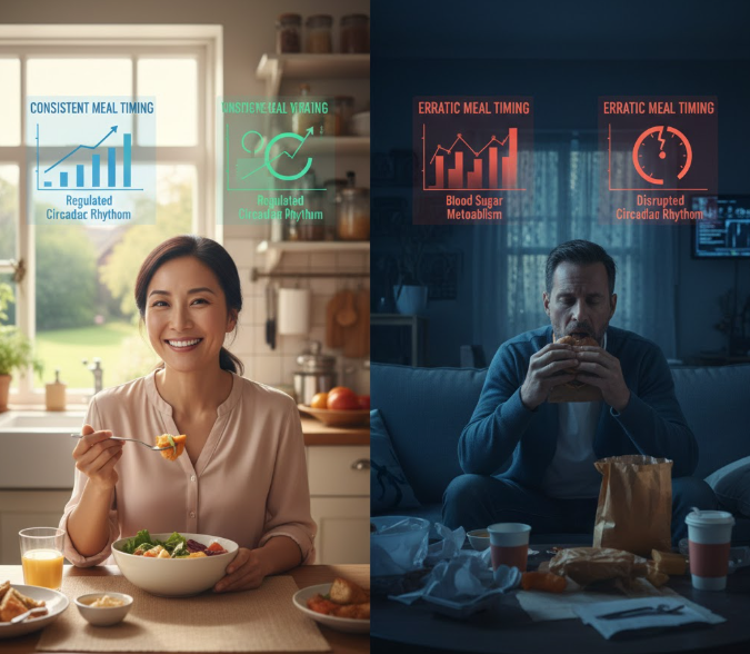 A Harvard study tracking over 100,000 people found that irregular meal patterns increased type 2 diabetes risk by 44%. Regular meal times helped keep blood sugar stable and reduced this risk significantly.